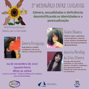 A Atividade Curricular em Comunidade e Sociedade (ACCS) – Políticas Públicas de Cuidados para as Diversidades, realizada no Semestre Letivo Suplementar da Universidade Federal da Bahia (UFBA), tem o prazer de convidá-las(os) para o 3º Webinário Entre Cuidados, que ocorrerá no dia 04/11/2020 (quarta-feira), das 18h30 às 20h00, debatendo o tema: