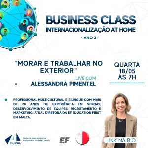 maio 18, 2022 Business Class – “Morar e Trabalhar no Exterior” 07:00 - 09:00 @ Zoom Acesse o link: https://us06web.zoom.us/j/83054366785?pwd=R29mNnQ0R0pURmZkWFZvNXRkdk5nUT09